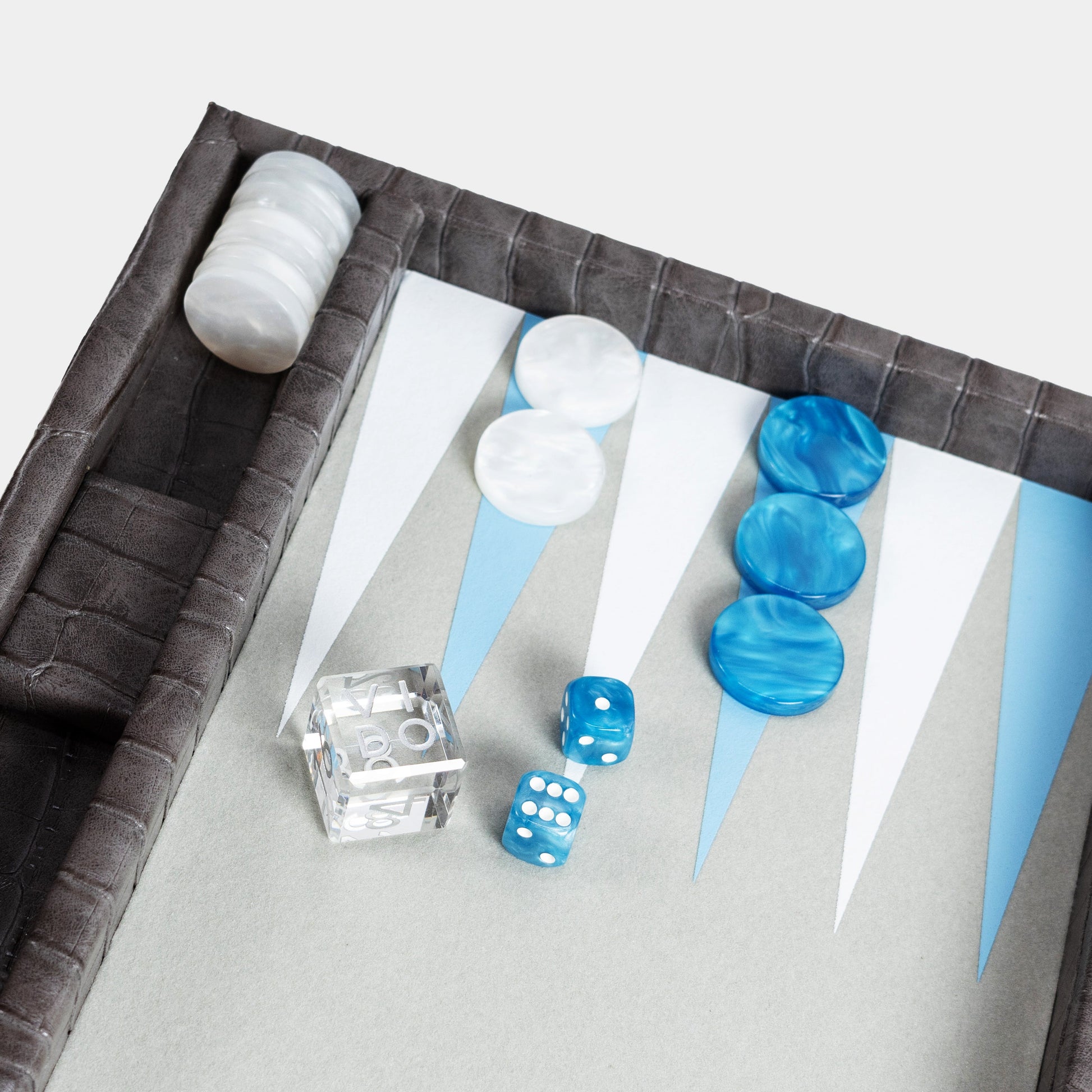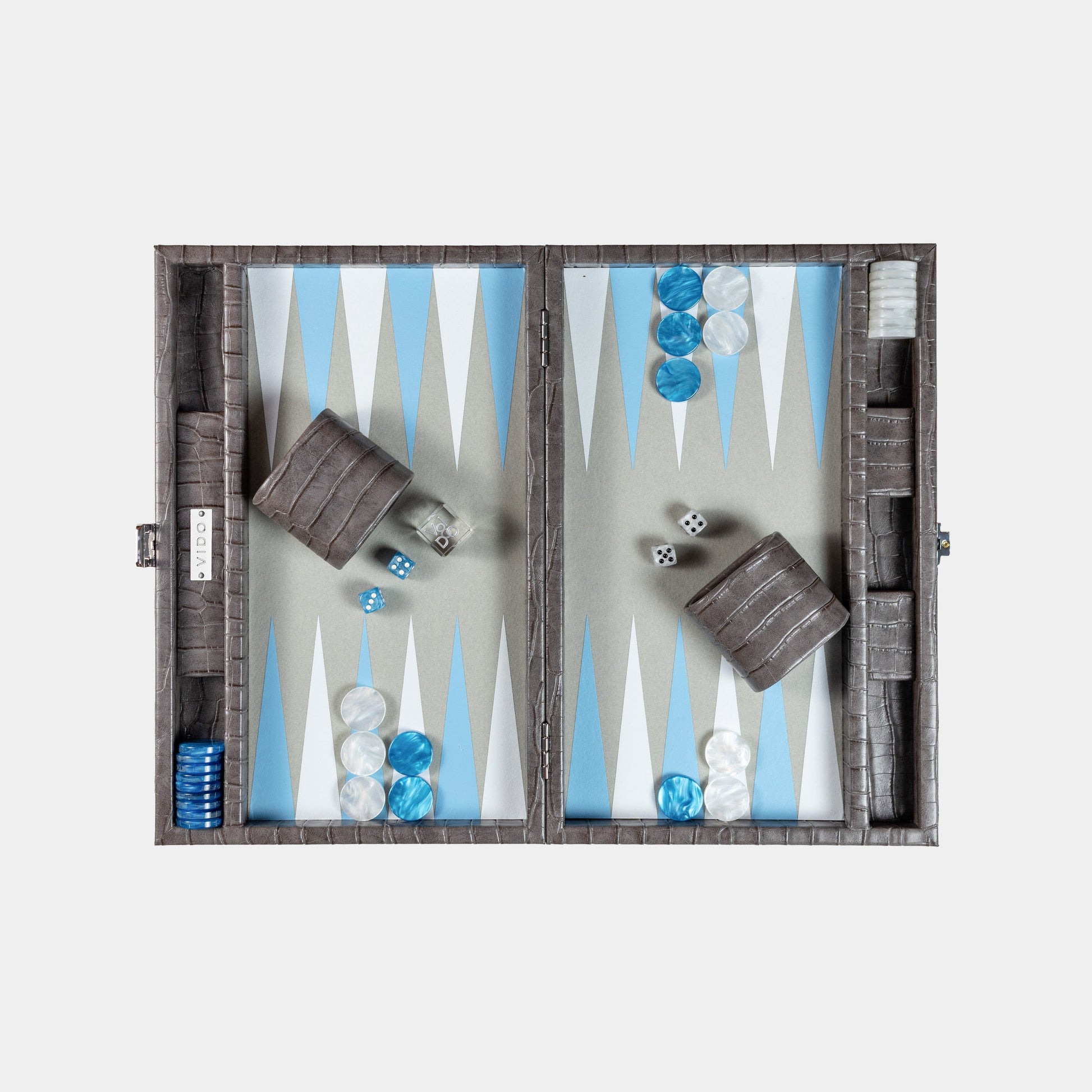 Designed for style and versatility, the Anthracite Grey Alligator Medium Backgammon pairs a soft felt playing surface with textured vegan leather. Its compact format makes it ideal for both home play and travel, without sacrificing elegance.