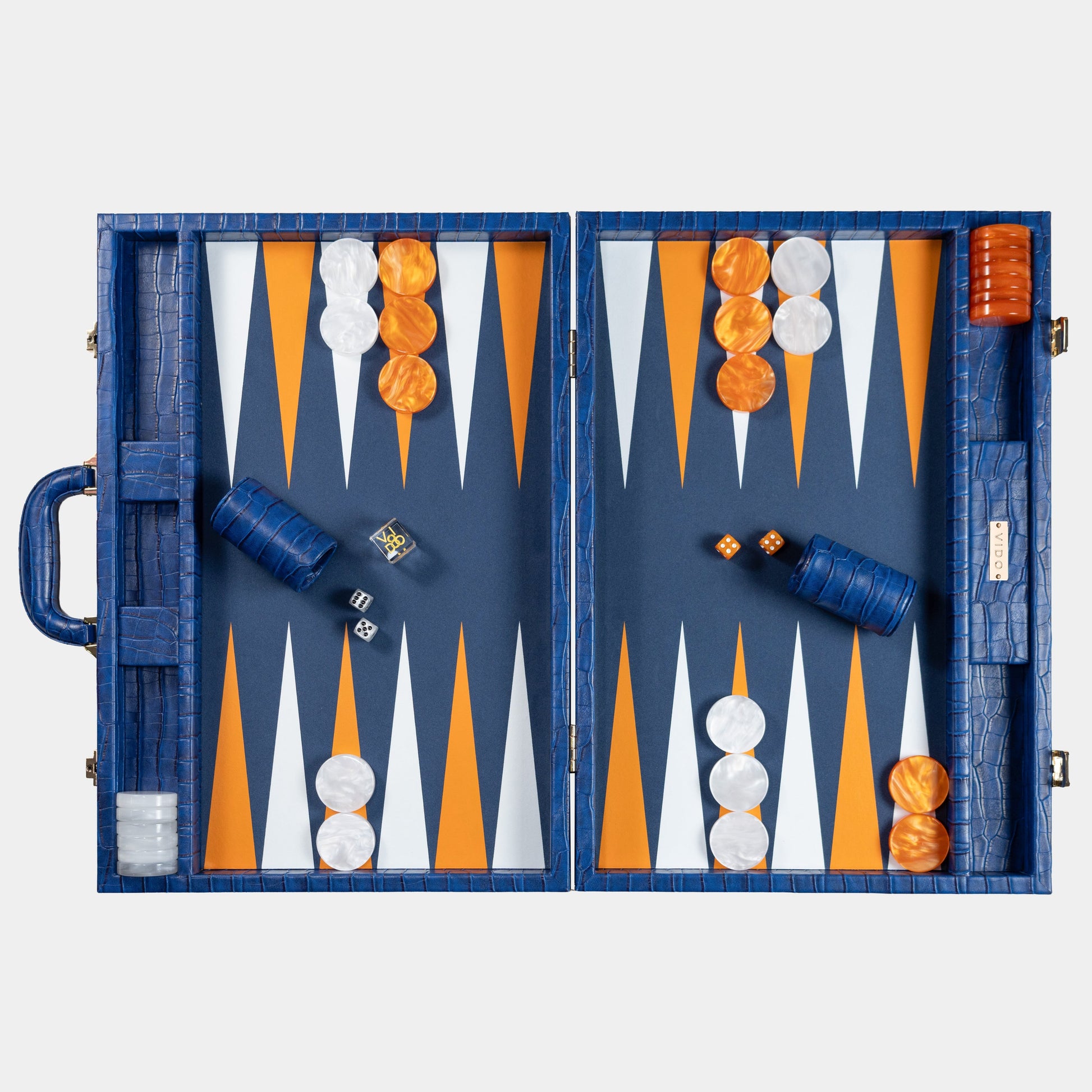 Timeless and elegant, the Navy-Blue Alligator Large Backgammon features a smooth felt playing surface and deep navy alligator-textured vegan leather. Its large format offers premium comfort, making it perfect for serious players and luxury interiors.