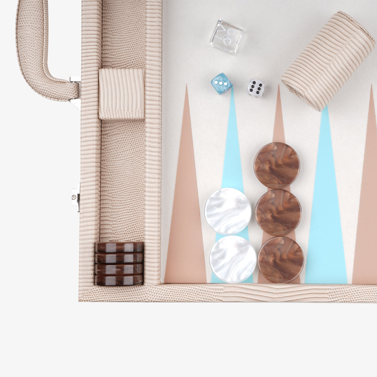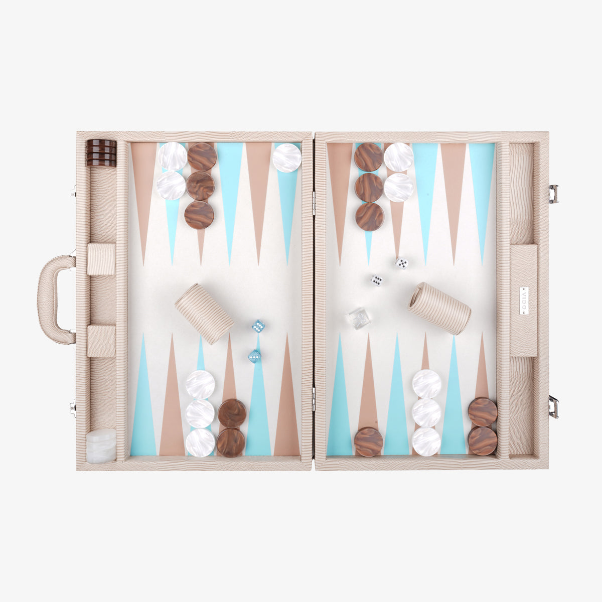 Our Beige Lizard backgammon set is carefully crafted with vegan leather, premium checkers and dice, and our signature VIDO doubling cube made of genuine crystal.